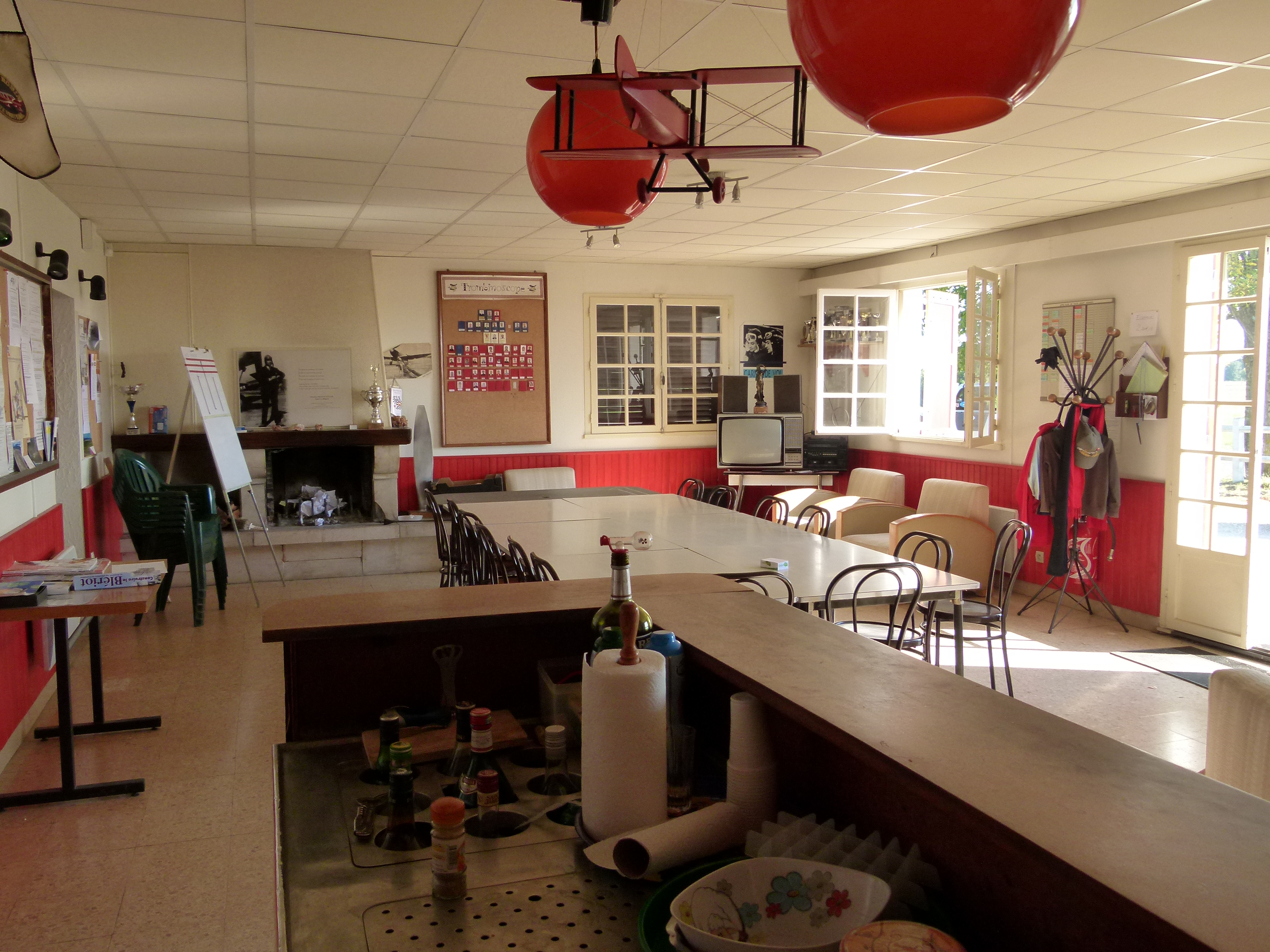 De l'autre coté, le coté convivial de l'aéroclub s'organise autour du bar et d'une salle permettant d'organiser quelques diners. Une cuisine est également accessible pour organiser les repas.