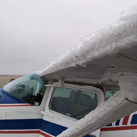 De la glace collée sur les bords d'attaque, ailes, empennages et certainement hélice. Trahissant le passage dans une zone à fort givrage, qui, peut être en ciel clair avec de l'eau en surfusion, heureusement cas beaucoup plus rare.